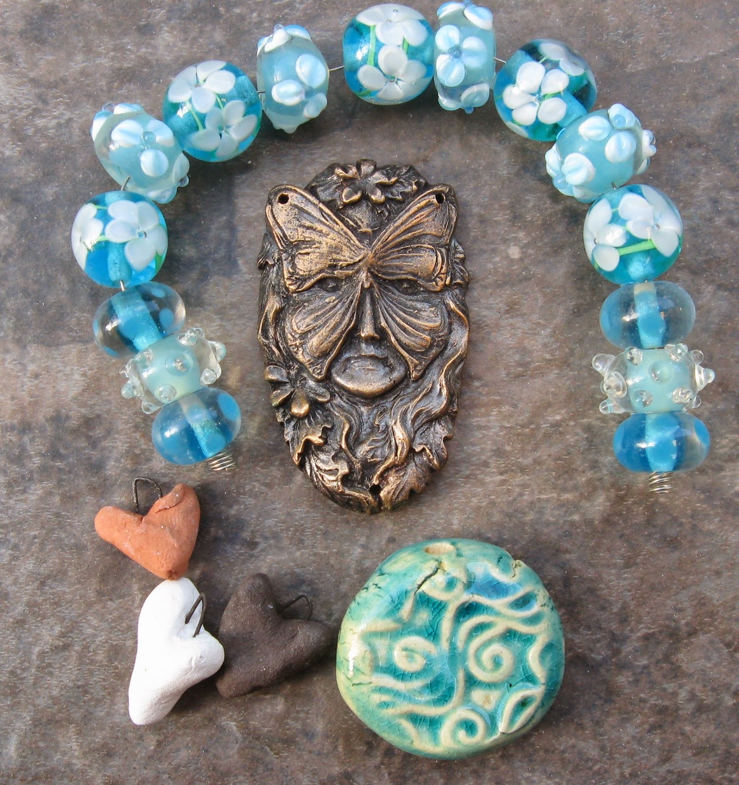 Ah ha! Now we are talking! Everything is working together - cute wood flower beads, large vintage Lucite blue floral focal, and YES! I finally found a use for these tri-color (yellow, green, blue) glass nuggets that are one of the first bead purchases I ever made back in 19mumblewhatever during my first trip to a bead store. I've had a whole bag of them sitting in my stash ever since then waiting for the perfect project. It just goes to show that if you hold onto the beads long enough, inspiration will eventually find a home for them. They have more blue in them (to match the focal) than shows in the photo. 4 ply gold cord and a copper rope toggle finish things off perfectly.